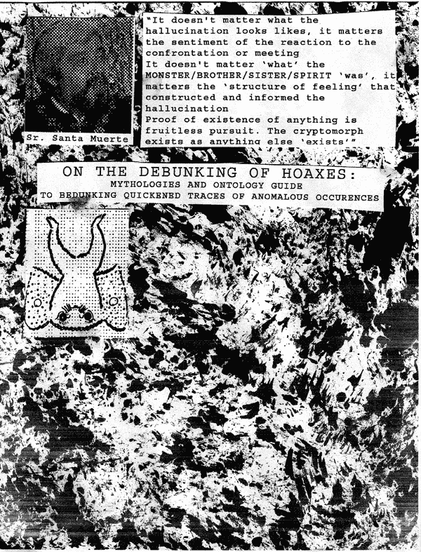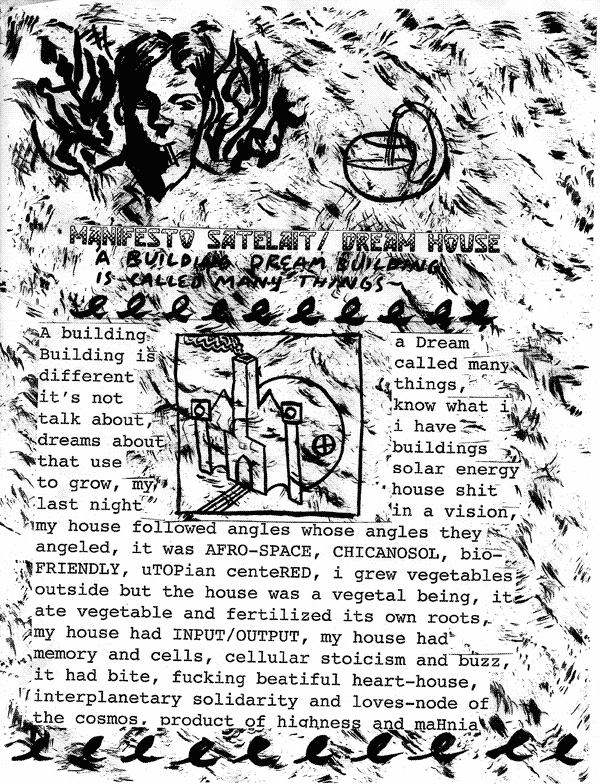 ![]() | (abstract) It doesn't matter what the hallucination looks likes, it matters the sentiment of the reaction to the confrontation or meeting I once wrote to debunk hoaxes and myths, but as I progressed on each debunking project, I would become more and more confused. I realized that the sighting of anomalies was by nature and definition anomalous. Furthermore, I realized that all anomaly is really variation. I began to see all variation and change as anomalous and in consequence many mundane things in the world; flowing water, growing hair, roadkill, movement of bodies, acceleration and even stasis became as odd and frightening to me as mothman, chupacabra or cattle mutilation. And slowly, my recognition of the anomalous spread to include more and more the the things around me until everything that filled my senses was foreign and struck terror in me: a boy's head cracked by a policeman's fist, my voice slipping across the wind, Lopez-Feliu's hair growing year by year, iron against lubricated iron, a skyscraper falling in a pile, the rapidly worming distances between my eyes and distant views... All is now in flux and changing, everything is anomalous and hoax; even the hoax and story of gravity only dictates one direction of many directions and can be called into question as readily as the mothman hoax--our blood flows up and down, across and back, pumped by a strange hoax--the heart muscle, flowing through strange mythic channels called veins. These words follow a mythical set of systems to become a strangely manifest hoax. The myth of dictated words in mythical symbols representing ideas (themselves anomalous and deceptive) laid down in quick drying hoax-ink on a mythical and unprovable substrate. This paper that you hold in your hand and the content on it and the brain functions that lead you to understand it are all unprovable hoaxes perpetuated by over-active imaginations susceptible to the influence of myth. "On", "over", "on top", "based on"... all orientation and relation is ghostlike and anomalous. Directionality and placement, composition and divine order are hoaxes and mythologies. We exist and ultimately are mythical- like a play with no director or audience, no script or stage, no actors, no props... for reference please see mirror scene in Duck Soup, mythical movie from the hoax year of 1933. A building a Dream Building is called many different things, it's not know what i talk about, i have dreams about buildings that use solar energy to grow, my house shit last night in a vision, my house followed angles whose angles they angeled, it was AFRO-SPACE, CHICANOSOL, bio-FRIENDLY, uTOPian centeRED, i grew vegetables outside but the house was a vegetal being, it ate vegetable and fertilized its own roots, my house had INPUT/OUTPUT, my house had memory and cells, cellular stoicism and buzz, it had bite, fucking beatiful heart-house, interplanetary solidarity and loves-node of the cosmos, product of highness and maHnia I got scared of blooming inspiration shocked my eyes opened and closed gliding and sliding We are little more than exotic beaded creatures encrusted and made up of single unite of colorful round balls connected by the thread of electricity I shouldn't be worried with enough food in my system I can call on the highness of inspiration at many points of interface I face its face and see not one thing but instead every thing integrated and mainlined through sensations more akin to touch and more wisp-like than memory Tendrils and vessels of intelligent plant organism interface and coordinated |